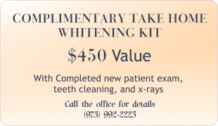 Call today to set up your appointment and get a complimentary take home teeth whitening kit a ($450 value) with completed new patient exam, teeth cleaning and, x-rays. Keep your 6-month recall visits and you’ll receive additional gel as needed for life!